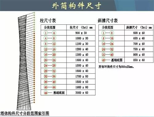 廣州塔的塔身由下而上富有大小變化。其中,底部橢圓直徑尺寸約為60米×80米,高寬比為7.5;中部最細(xì)處橢圓直徑約為30米,高寬比為7.3。上部橢圓直徑尺寸約為40.5米×54米。24根立柱的間隔距離相當(dāng),協(xié)調(diào)統(tǒng)一。