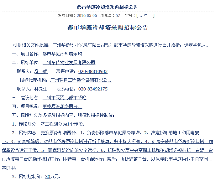 第三方網(wǎng)上公開冷卻塔招標(biāo)信息: