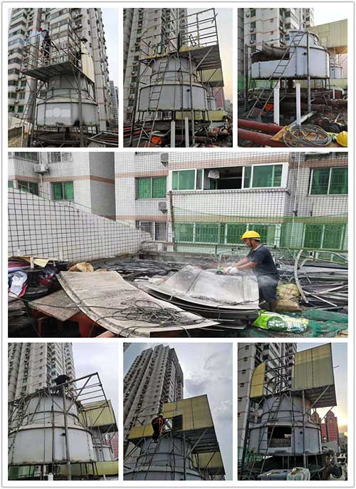 鴻翔花園位于深圳老城區(qū)之一的羅湖蔡屋圍區(qū)松園路。由于冷卻塔使用壽命長,冷卻塔填料老化,需要更換冷卻塔填料。接下來,根據(jù)鴻詳花園圓形冷卻塔填料的更換,介紹了拆卸和更換圓形冷卻塔填料的正確過程。 在清除