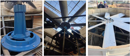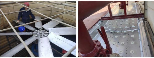 安裝新的冷卻塔超靜音風機,拆掉出風口消聲器 更換新的冷卻塔不銹鋼接水盤